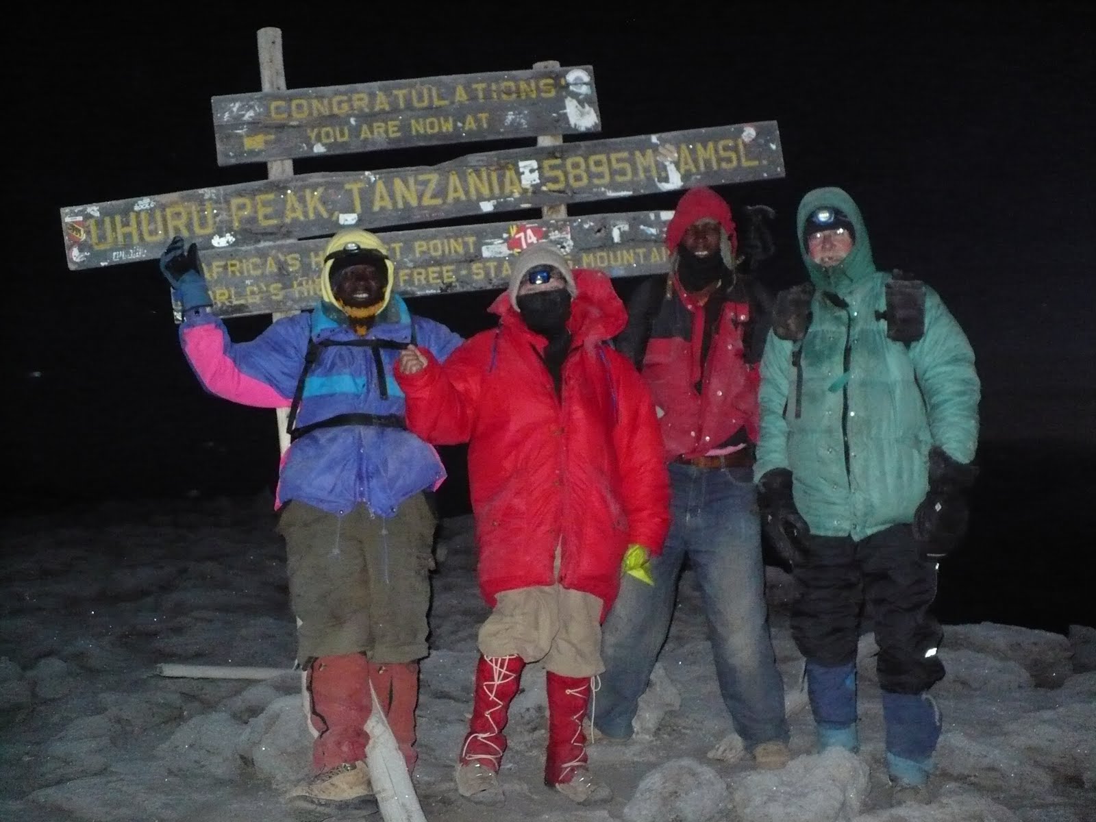 The summit was quite cold and windy - I am guessing perhaps -10F. There was a fine mist which had coated the rocks with frost, but the footing was adequate, not too slippery. During the ascent below Gilman's Point there were times when the wind got chilly, and times when I was hiking in a T shirt, long underwear top, light sweater and lightweight long sleeved shirt (in other words, rather lightly dressed). I did not put on my heavy parka until about 3 hours into the climb. At the same time, I removed the sweater and shirt, so I went to the summit with a T shirt, long underwear top and heavy parka. I had a light weight balaclava, a wool stocking hat, and heavy wool mitts. The parka had an excellent hood that I would use intermittently.